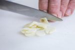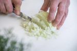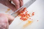 Zwiebeln und Knoblauch (2 Zehen) schälen und vom Ingwer eine Scheibe (ca. 10-15 g) abschneiden, sowie die Zwiebeln grob würfeln. Die Chilischote putzen, Kerne entfernen und sehr fein würfeln, 1/3 für das Topping zurückstellen.
