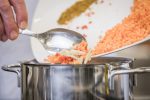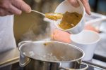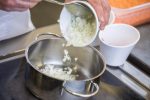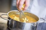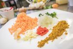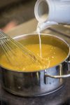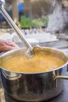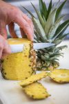 Inzwischen etwa 40g Ananasfruchtfleisch in ½ – 1 cm große Stücke schneiden und für das Topping bereitstellen. Den Rest grob in Stücke schneiden, zur Suppe geben und weitere 5 -10 Min köcheln lassen und 100ml Kokosmilch zugeben.