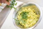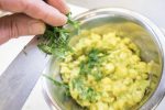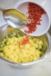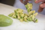 Das Fruchtfleisch einer Avocado in ½ – 1 cm große Stücke und die restliche Ananas in ½ cm große Würfel schneiden. Mit Ananas und den zurückgestellten Chiliwürfeln mischen. Koriander (4 Stiele) waschen, trockenschütteln, Blätter zupfen und unter das Topping heben.